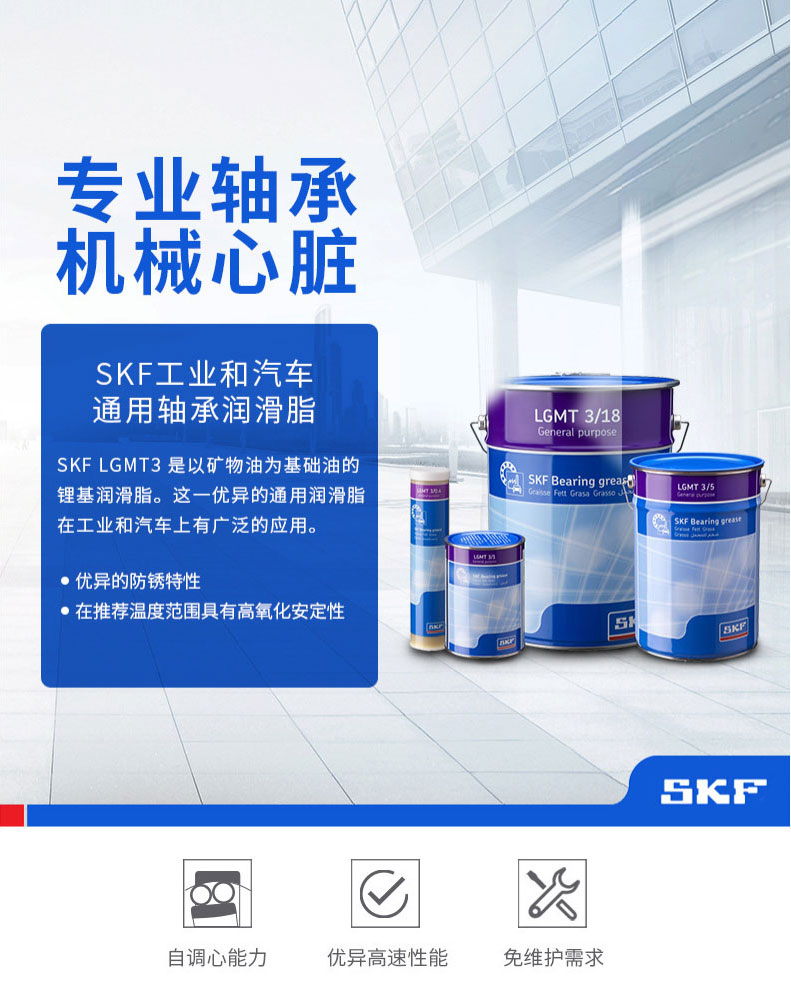 SKF工業和汽車通用軸承潤滑脂 SKF潤滑脂是以礦物油為基礎油的鋰基潤滑脂。這一優異的通用潤滑脂在工業和汽車上有廣泛的應用